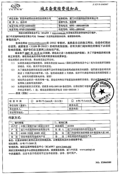 廈門地區(qū)出現(xiàn)的部分不法分子冒充工作人員,以發(fā)傳真或打電話的方式對客戶實施欺詐,企圖損害客戶的合法權(quán)益。如果通過了解客戶知道了域名為某某公司注冊的,而不是在他們廈門公司注冊的,這些不法分子通常謊稱“某某公司不做了,域名轉(zhuǎn)到他們公司了”或者說“你們這個某某公司是他們的分公司”等,隨后即要求將域名續(xù)費款交到其指定賬戶上。在此,信服科技鄭重提醒廣大用戶留意上述行為,避免上當受騙。
