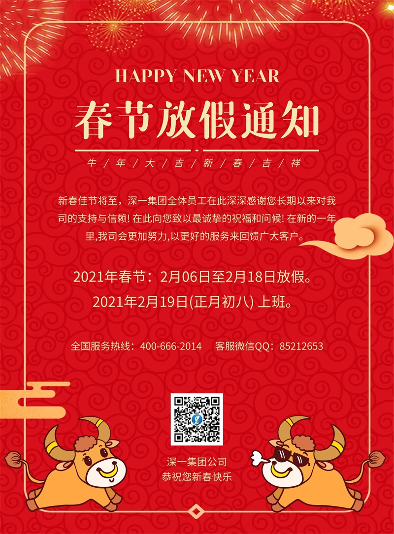 發(fā)布日期:2021-02-05 關鍵詞:【深一集團】2021年春節(jié)放假安排通知 已有 18167 人瀏覽